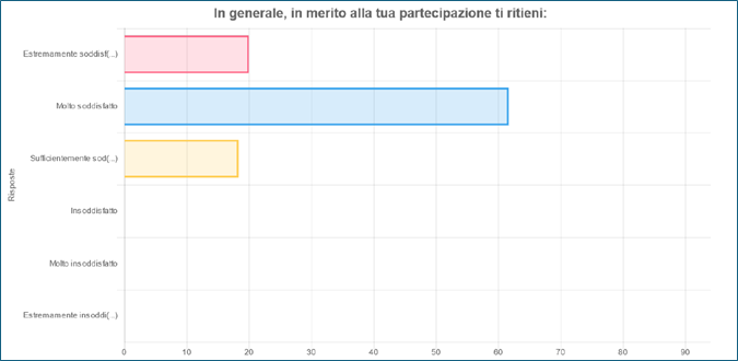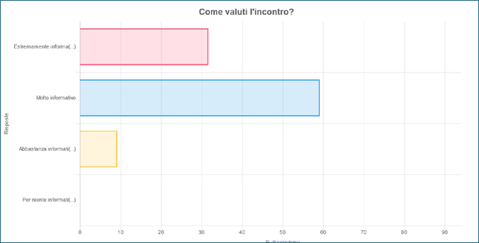 Dai risultati delle survey, che vi inseriamo qui di seguito, potete notare una valutazione estremamente positiva sia degli incontri sia del materiale formativo offerto.