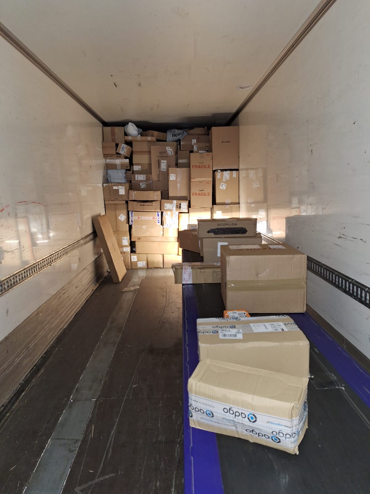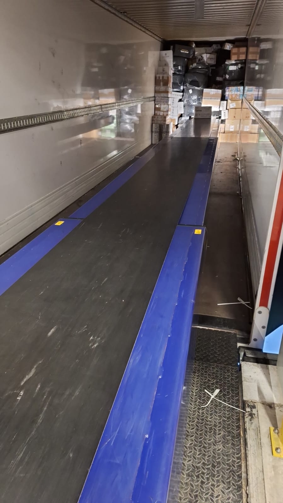 Per implementare questo metodo, abbiamo introdotto anche una modifica nel processo di caricamento e scaricamento dei pacchi dai bilici. Viene utilizzato il sistema del telescopico a nastri, noto come “Telescopic conveyor classic”, che consente di caricare e/o scaricare il rimorchio direttamente al suo interno. Grazie a una parte del sistema estraibile o retrattile, è possibile raggiungere lunghezze fino a 21 metri, di cui 7 metri sono parte fissa. La velocità del nastro si aggira intorno ai 0,5 m/s e, grazie alla sua struttura resistente, può sostenere il proprio peso, il carico trasportato e le funzioni opzionali.